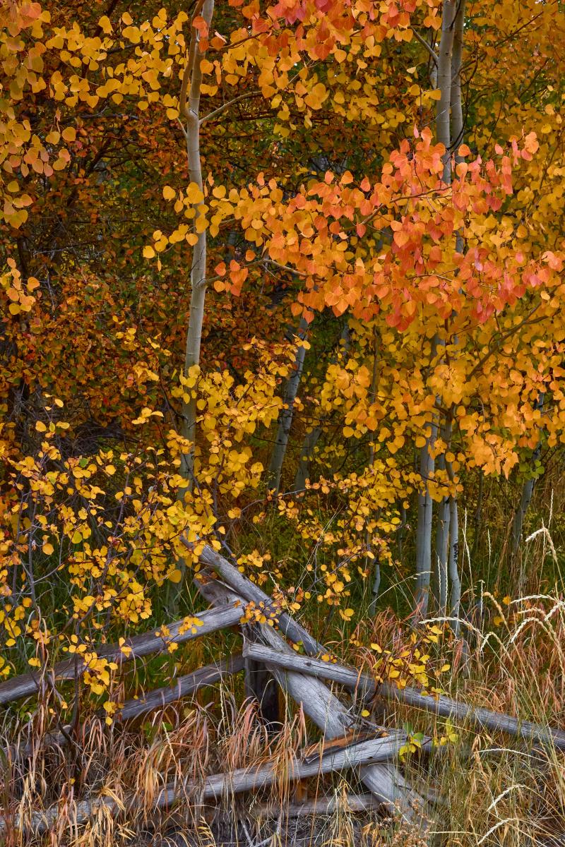 I love how the colors and textures of this photograph almost feel painterly. On a cold, rainy October day I was driving the backroads on the west side of the Tetons when I found this stand of golden Aspens bordered by this disused fence. The location suggested that the fence once enclosed horses and cattle, but the fields had gone wild and obviously nothing had been grazing there for many years. But the remnants of the old log fence told the story. Cloudy, rainy days always reduce contrast and create beautiful, soft shades of color and light.