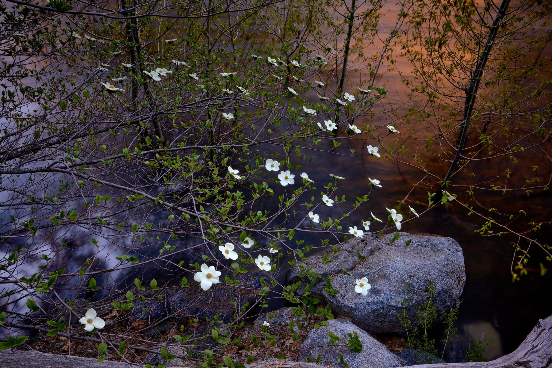 When I learned of the historic snowpack and related historic water flows in Yosemite in the spring of 2023 I made the journey to California for a couple of weeks to photograph waterfalls and landscapes impacted by the floods. The Pacific Dogwoods were in bloom and I really wanted to make a photograph inspired by one of my favorite Ansel Adams pictures. The stars aligned on my next to last day when I found this scene as a rain shower was passing out of the valley and the air was clean and still. You can see the remnants of the rain clouds reflected on the left side of the frame, seemingly held in place by the dogwood tree. The warm orange-red color reflected on the river in the right of the frame is the sun reflecting from the valley wall on the other side of the river.