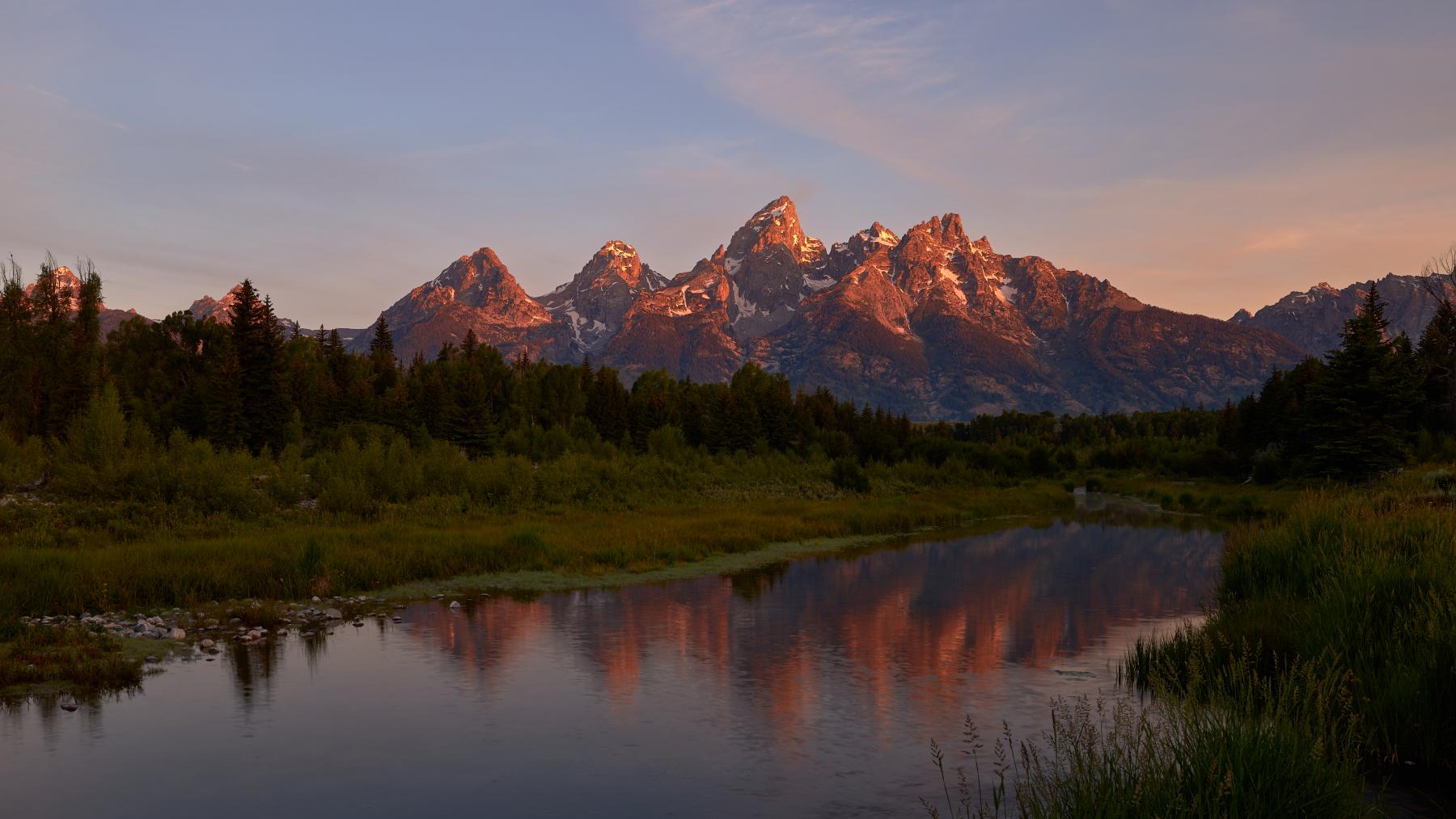 Friends from out-of-town had made plans to shoot sunrise at Schwabacher's and I agreed to meet them there. The nearly cloudless sky didn't bode well for the dramatic sunrises this place is famous for, but the warm light on the mountains and the wisps of clouds that were forming as the earth warmed made for a beautiful morning at a favorite location.