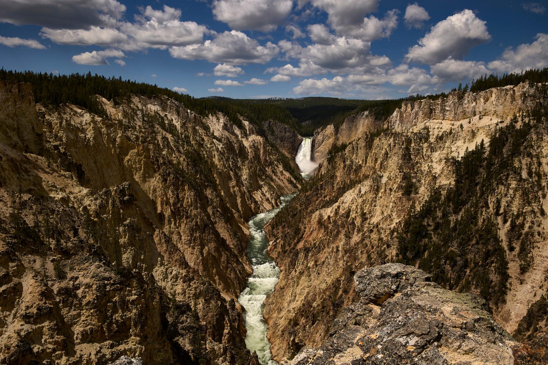The Grand Canyon of the Yellowstone is about 28 km (17 miles) long, 250–350 meters (820–1150 feet) deep, and 450–1200 meters (1500–4000 feet) across. Lower Falls is about 100 meters (308 feet) high. The canyon was formed since the last glaciation (about 20,000 years ago) by water erosion along a fault that supported a lot of geothermal activity, as we can tell by the kinds and colors of rocks on the canyon walls. July 4, 2022