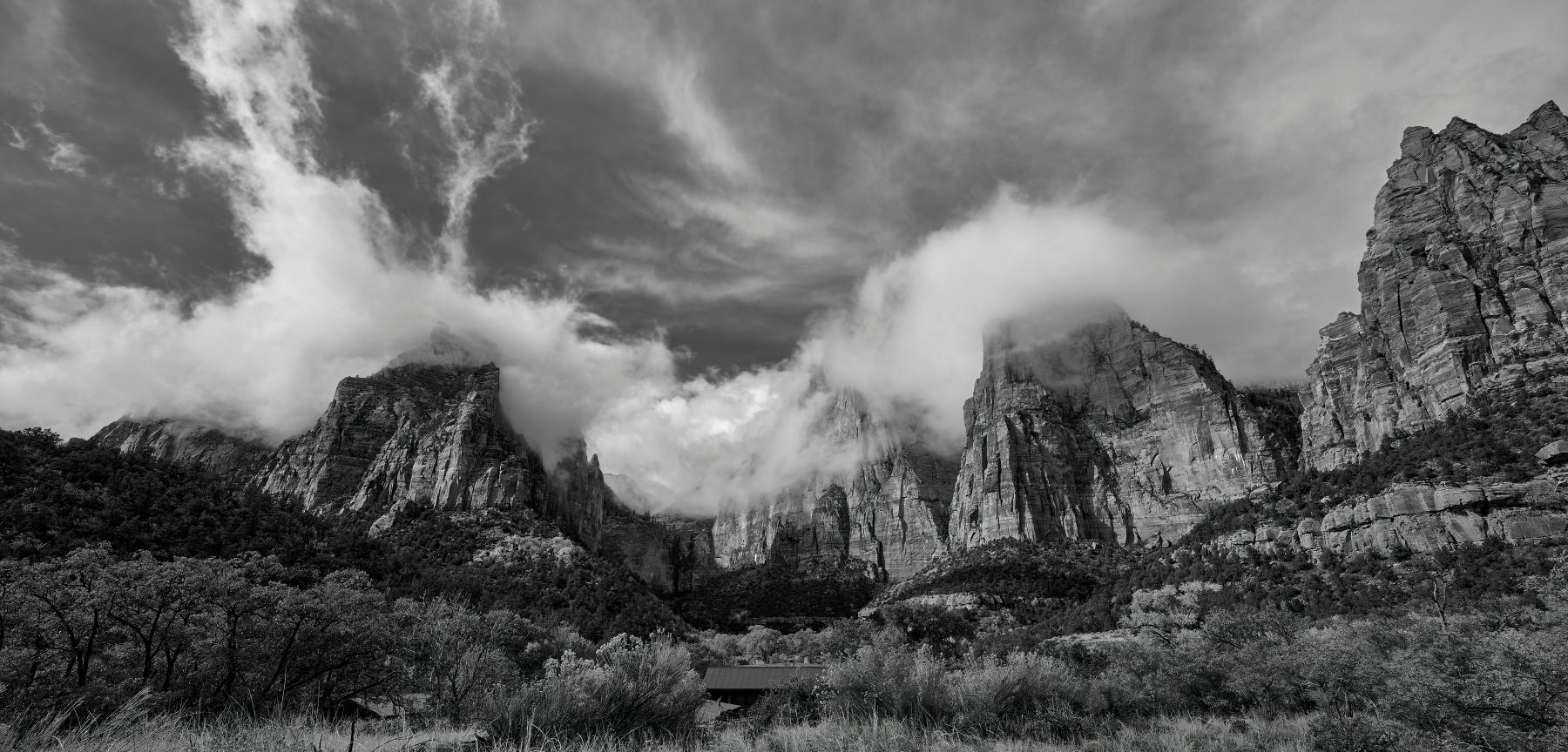 October can be a magical time to visit Zion NP. The light is low and slanting and the possibility of rain or snow storms is omnipresent. I made this photograph later in the day when the sunlight was shining in under the clouds as they were lifting from the valley floor.