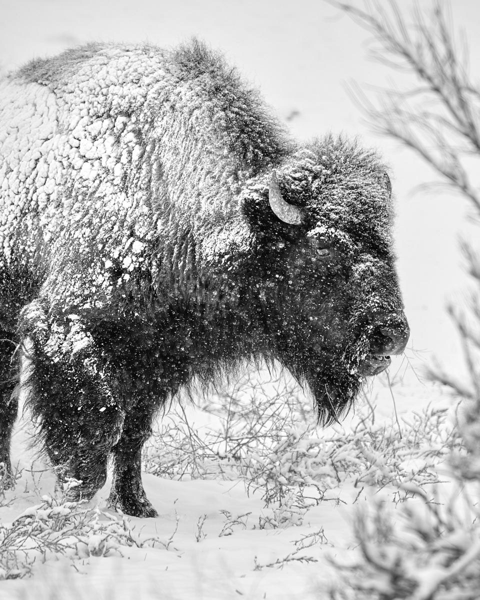 The Bison in Yellowstone National Park are the only bison in the States who have remained on the same land continuously for around 10,000 years. Scientists estimate that there were between 30 and 50 million bison in North America in 1700, by 1900 they were nearly extinct, the number having fallen to just a couple hundred souls. In Yellowstone the number of surviving bison dropped to just a couple dozen wild, native bison living in the park’s interior, in Pelican Valley. In 1902 Yellowstone’s managers purchased 21 bison to be used in a captive breeding program, eventually these bison were allowed to mix with those remaining in the park. By the beginning of the winter of 2022 / 2023 there were an estimated 6000 bison in the park. That was a very cold winter with lots of deep snow, even in the northern range where snow depth is generally much less than other areas of the park. The bison have genetically been selected to shrug off cold and snow as long as they can access food and water, and they followed ancestral migration routes along the Yellowstone River, to the meadows and sagebrush steppe along the river north of Gardiner, Montana. However, the river soon flows out of the park into National Forest and private land, where bison are legal game for a few lucky license -holders and the members of 7 Native American tribes with hunting rights guaranteed by treaty. A kill quota is set by The Interagency Bison Management Plan, drafted by a political committee, rather than set by scientific methods due to the region’s powerful livestock owners lobbyists. Despite being America’s national mammal, not everyone wants them living free on the landscape, competing with cattle for public grazing lands. Over the winter of 22/23 about 1600 wild, native, free-roaming bison were slaughtered. These animals had no fear of humans and trustingly walked right up to their doom. Photo was made on March 6, 2023 along Old Yellowstone Trail, in Yellowstone National Park. “Bison, Blizzard - 2023”
