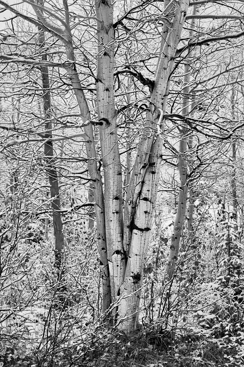 I was in Teton Canyon several years ago in early October when the first measurable snow had just fallen. I was driving slowly along the gravel Forest Service road when I came around the corner and came face to branches with this scene, and spent the next couple of hours exploring it. I love the textures as much as the subtle variations of light and contrast.
