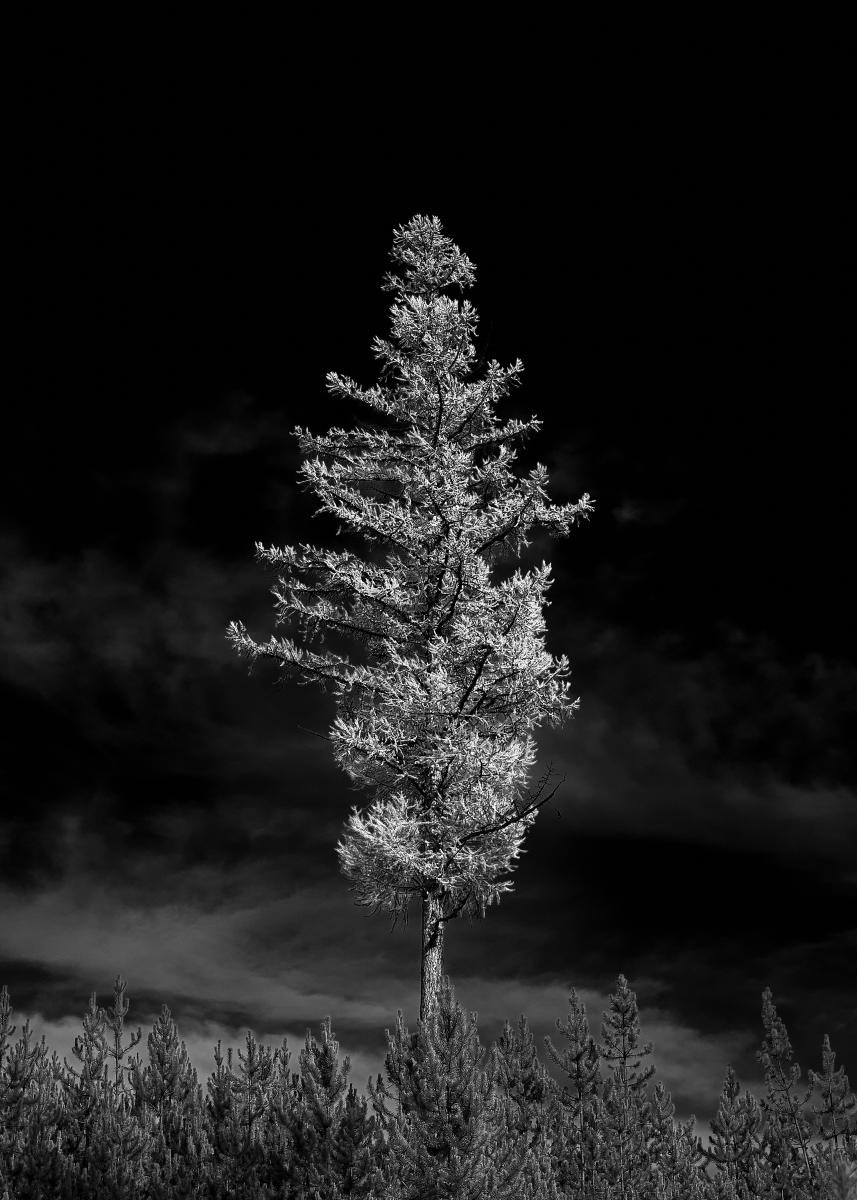 This are of Glacier and the adjacent National Forest had experienced an enormous fire five or six years prior to my arrival. As with most forest fires not every tree or even every area are impacted as much as others and this giant Western Larch, while the bark was scorched on one side, survived. Now it towers over the regrowth of a Lodgepole Pine forest, the young pines appearing to me like so many toddlers mobbing their preschool teacher.