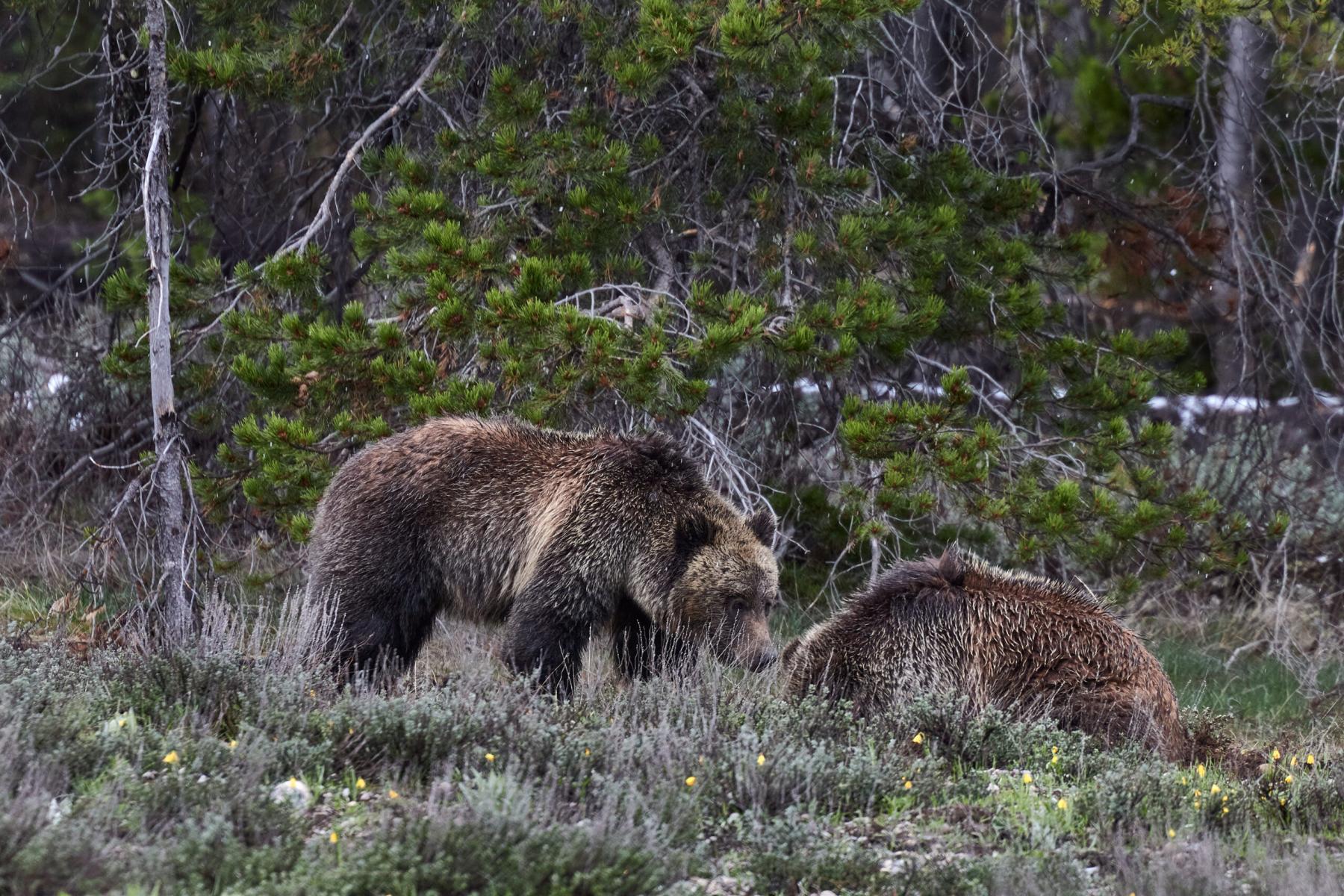 These two sub adult grizzly bears have only been on their own for a few weeks. Here they were grazing and digging for roots, beetle, grubs, and ground squirrels in a meadow in grand Teton national Park. Shortly after I made this photo the industrious bear digging for food swatted their sibling in the face very clearly saying "This is my spot, you go get your own!