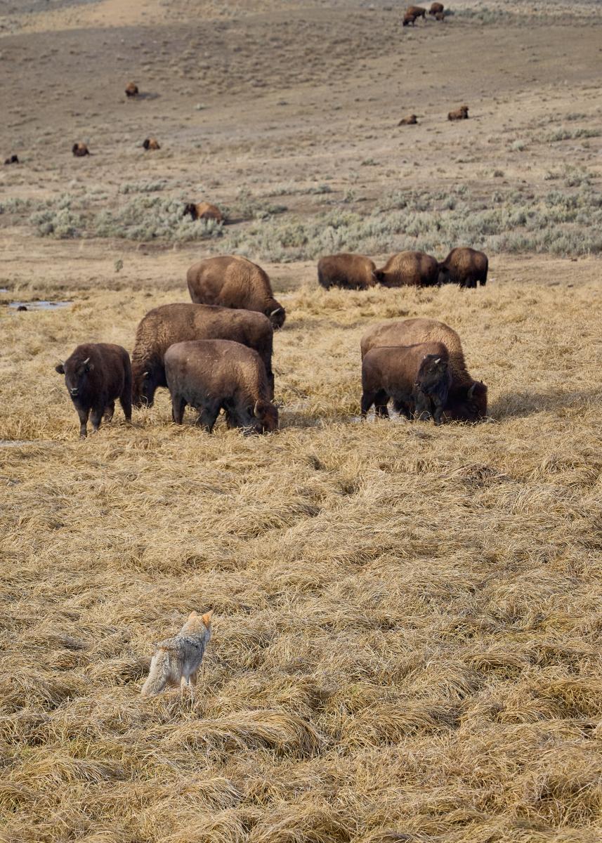 Another feeding adaptation the coyotes have in Yellowstone National Park is following herds of bison around waiting for them to flush small prey out into the open of the coyotes have a better opportunity to catch them