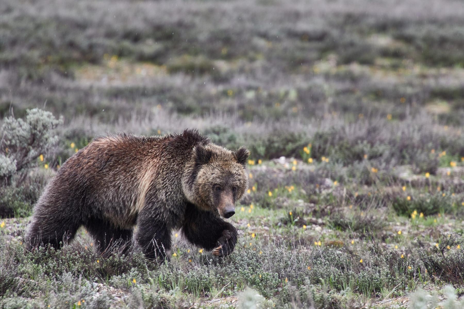 This young grizzly was moving from one feeding area to another walking right past a small group of photographers. Noticed the size of their front claws. Perfect tools for digging up roots and ground squirrels.