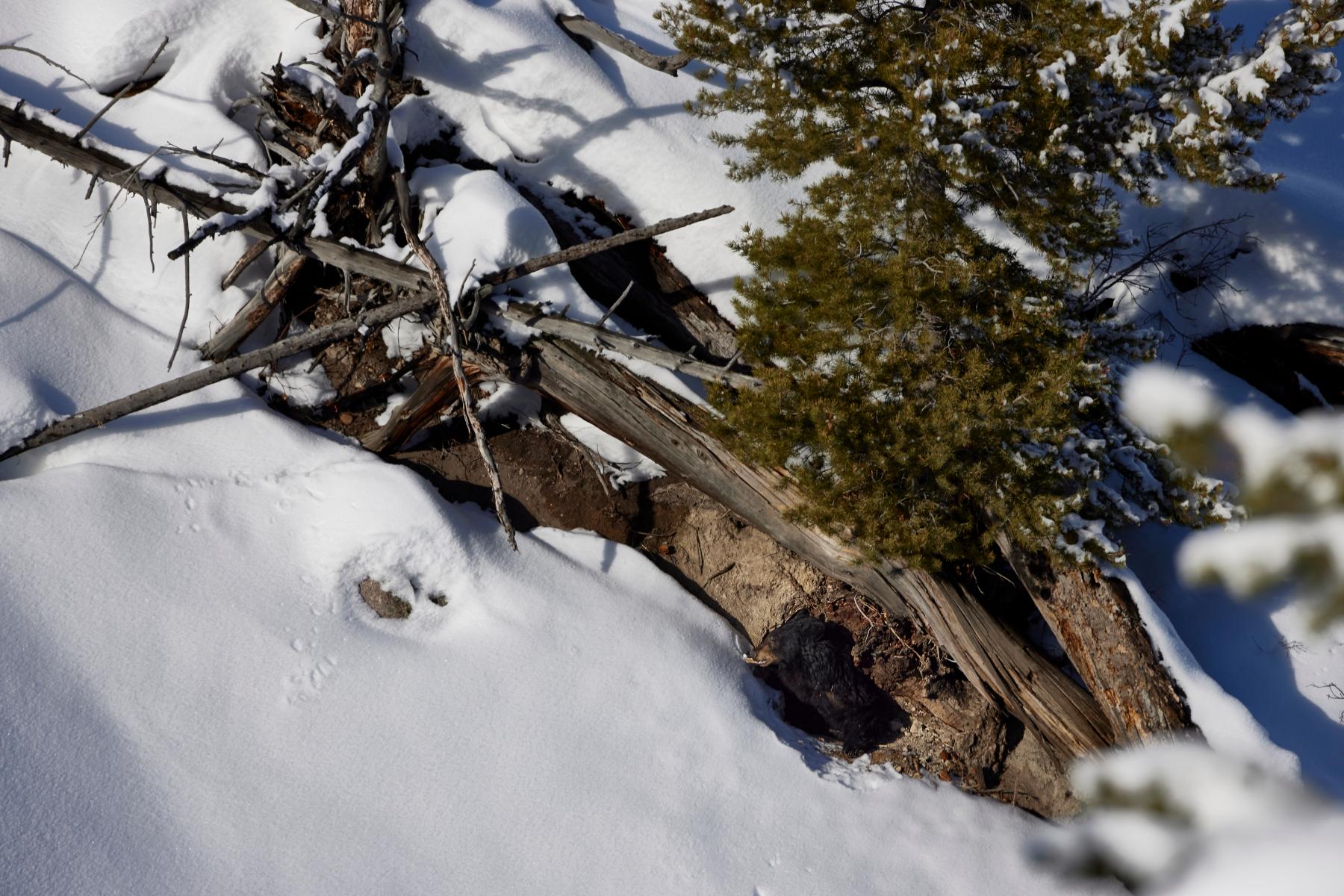 This hibernating black bear in Yellowstone National Park would stick his head and front leg legs out of its den on sunny warm days and eat a few mouthfuls of snow while lounging in the sunshine until it was gone and then retreated into the den.