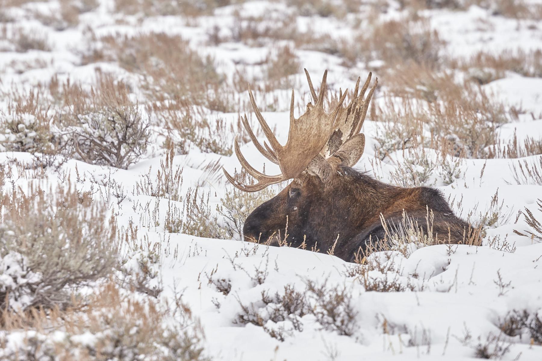 In late autumn, the moose of Grand Teton National Park move into the sage steppe to feed, socialize, and mate. When they lay in the sage to rest, they're all the invisible and it's very easy to come up on them unexpectedly while walking through what appeared to be an empty field.